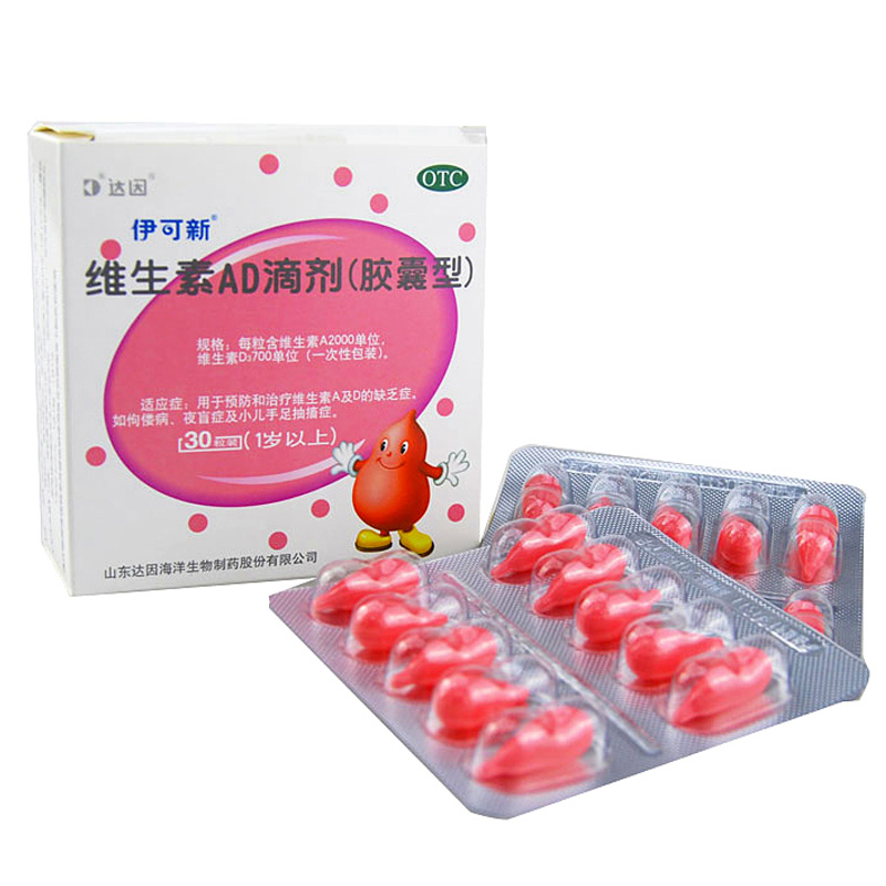 维生素AD滴剂(胶囊型),适应症为用于预防和治疗维生素A及D的缺乏症。如佝偻病、夜盲症及小儿手足抽搐症。